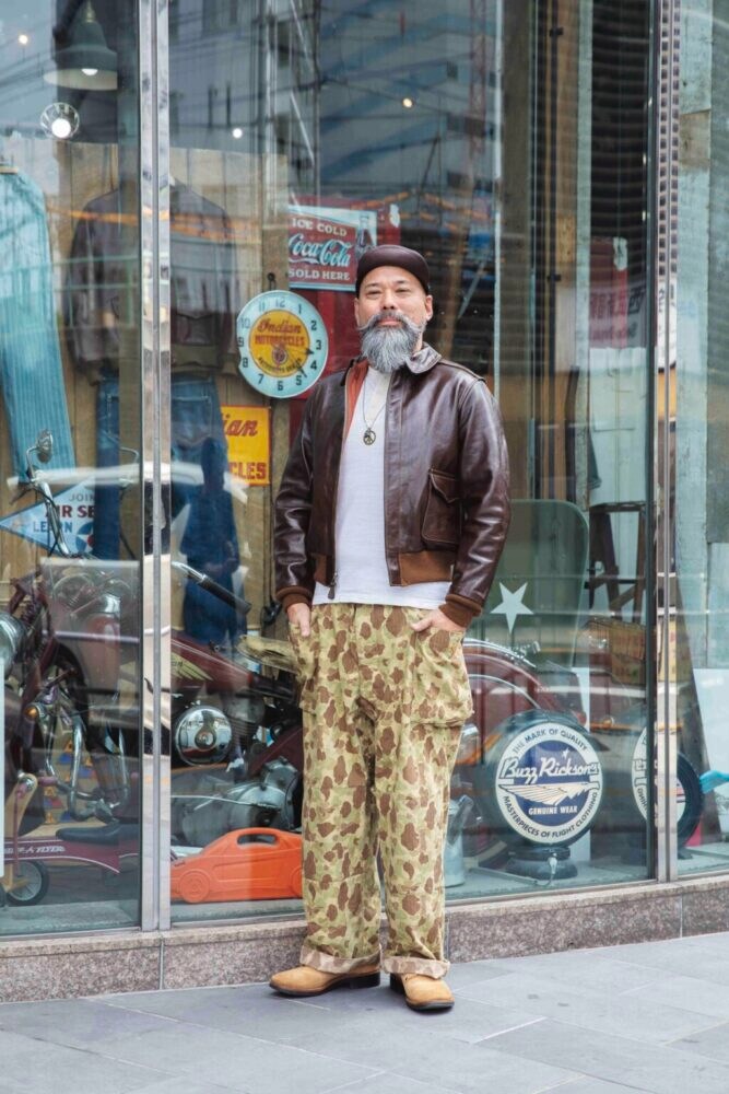 西さんが[A-2]を着用する際の定番のスタイル。武骨なフライトジャケットに対して、同じく武骨なダックハンターカモのパンツを合わせている。「個人的にこの組み合わせは間違いないと思っています。足元はスニーカーでも良いのですが、ミリタリーテイストのブーツを選び、キャップもブラウンレザーにすることで統一感を出しつつ、インナーはシンプルなヘンリーネックTシャツを選んで、“足しすぎず”を意識しています」