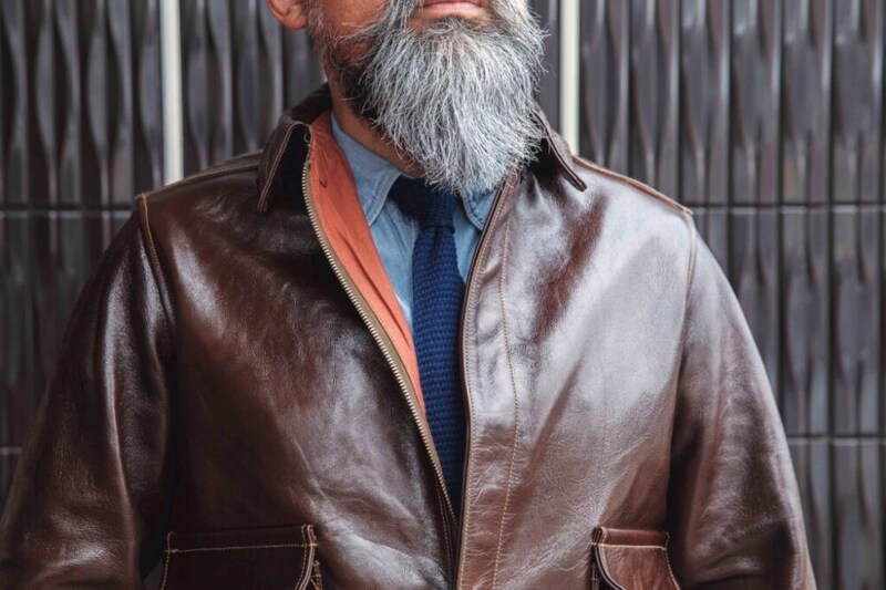 アメカジとドレスをミックスしたような上品なスタイル。シャツ、タイ、パンツをブルー系のワントーンにまとめているのもポイントだ。「アメリカのオフィサーのようなスタイルに、テーラードジャケットの代わりに[A-2]を羽織る、といったイメージです。フライトジャケットを品よく着たいのであれば、タイドアップに挑戦するのはかなりおすすめですよ」