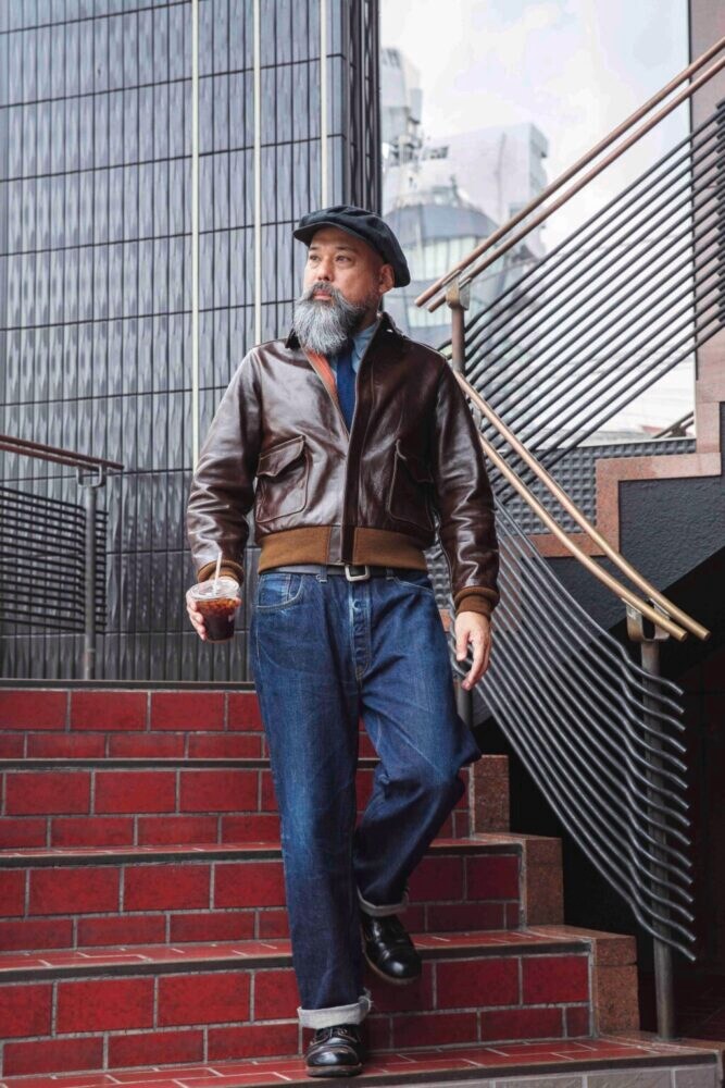 ジャケット24万2000円、パンツ3万7400円、Tシャツ1万780円、ブーツ8万6900円/すべてバズリクソンズ、キャップ/ミスター ファットマン、ネックレス/ヴィンテージ
