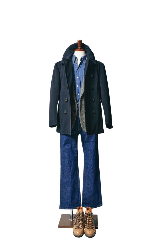 「劇中の装いをミックスさせたようなスタイリングです。難しいことはせず、素直にスタイリングを組みました。劇中でピーコートを着ているシーンでは、ジャケットを着てはいないのですが、別のシーンで着ているグレーのヘリンボーンジャケットをレイヤードした方が洒落ていると思い、2つのシーンを掛け合わせたというわけです。クラシックな10ボタンのピーコートは劇中のロバート・レッドフォードと同様に無造作に襟を立てるのがポイント。パンツはこの映画が公開された1970年代を象徴するようなブーツカットにトレッキングブーツという、こちらも劇中の装いをサンプリングしています。このブーツカット×トレッキングブーツは当時における定番の合わせともいえますが、いまの時代においても新鮮に感じられますよね。コーディネイト全体を見ても、時代性はありつつも現代にいても何ら違和感のない、程よいバランスに仕上がったのではないかと思います」