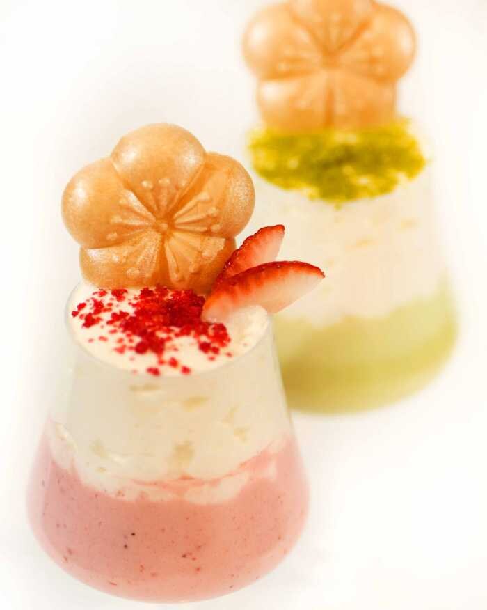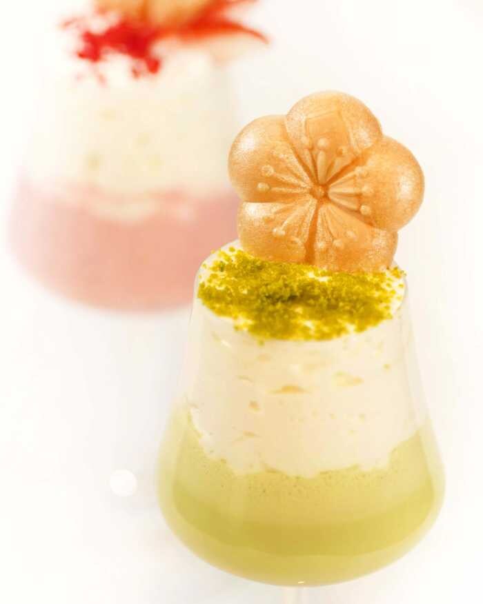 梅ヨーグルトエスプーマの軽やかさと、ピスタチオパウダーのナッティな風味が相性抜群です。梅の酸味が後味をすっきりまとめてくれるため、甘すぎず、冬の夜にじっくり味わいたくなる逸品。