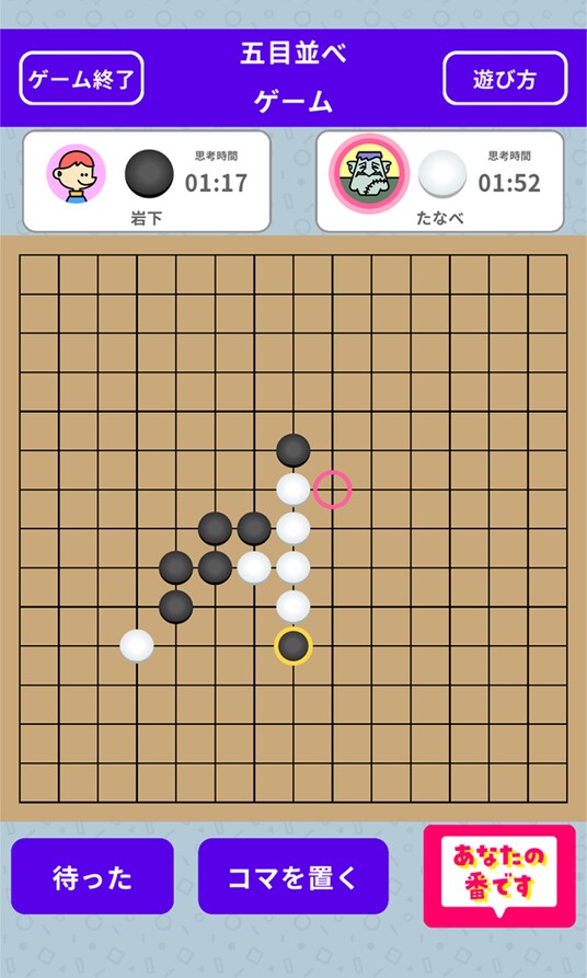 対局開始: タテ・ヨコ・ナナメのいずれかに、自分の石を連続で5つ並べた(五連)プレイヤーの勝利