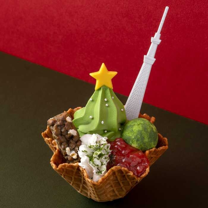東京スカイツリータウン・ソラマチ店限定「クリスマスツリーソフト」(1,150円税込)は、濃厚抹茶ソフトにいちごジャムやチョコクランチ、クッキーをトッピングし、星型チョコで華やかに仕上げています。