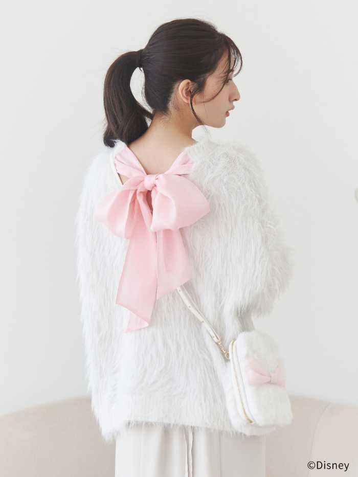 今回のコレクションの中でも注目したいのが、背中の大きなリボンが印象的な「ロングシャギーバックリボンニット」(13,200円税込)。