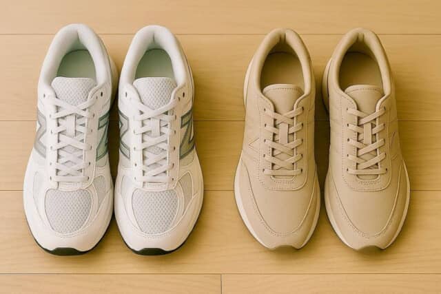 スニーカーは、同じ色味でもシルエットに時代感が出やすいアイテム。特に大人の足元を老け見えさせるのは、つま先が丸すぎるフォルムや、甲がもったり盛り上がって見える厚みです。こうしたデザインは視覚的に重心が下がり、全身の印象までどっしりして見えてしまいます。