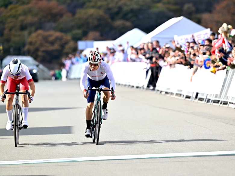 観客が湧く中、男子個人ロードレースで藤本六三志(写真右)が銅メダルを獲得しただれもが一緒にレースができる世界に
