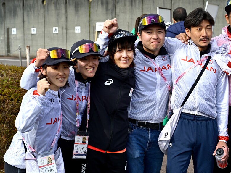 日本チームで写真に収まる早瀬(左から3人目)杉浦も早瀬も、だれもが一緒に自転車競技を、ひいてはスポーツを楽しめる未来をつくるために、全力でペダルを漕ぎ続ける。
