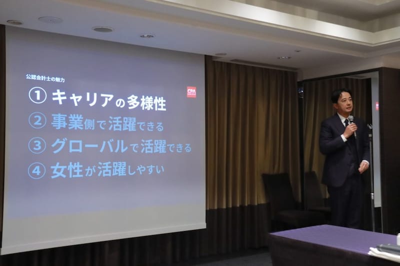 とコメントし、他にも「経理・監査・税務など事業側で活躍できる」「税務などでグローバルに活躍可能」「女性が活躍しやすい領域である」といった公認会計士の魅力を語りました。