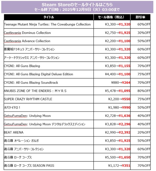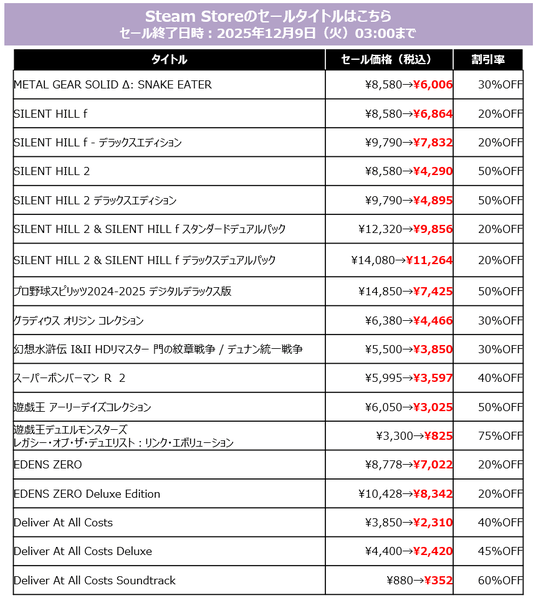先週から開催中のKONAMI「BLACK FRIDAY SALE」のタイトルラインアップは以下からご確認ください。