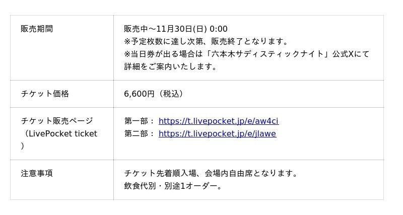 11月30日(日)には公式YouTube番組の公開生放送&ミニライブの開催も予定しておりますので、この機会にぜひ「六本木サディスティックナイト」の10周年をお楽しみください。