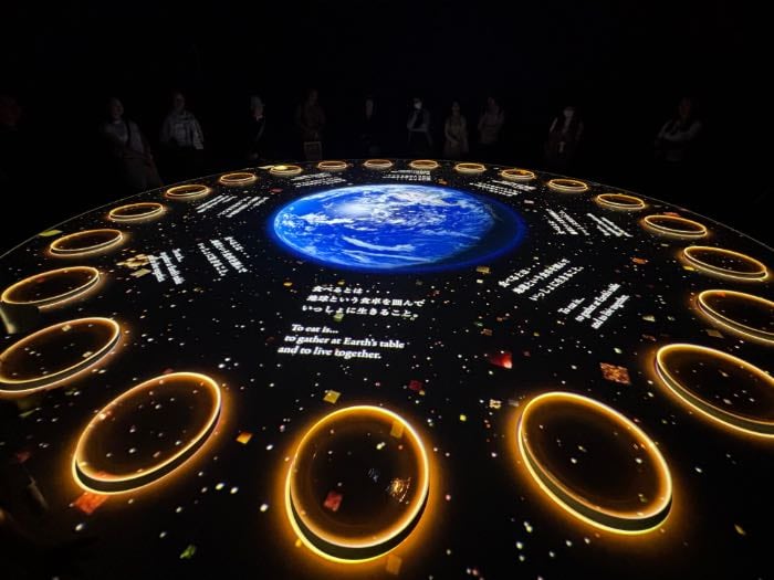 大きな丸い形のテーブルを模したモニターを、来場者みんなで囲みます。世界じゅうの食卓の映像が流れ、食事を楽しむシーン、目の前の真っ白なお皿には、お料理が写しだされ、華やかな映像と共にフィナーレを迎えます。
