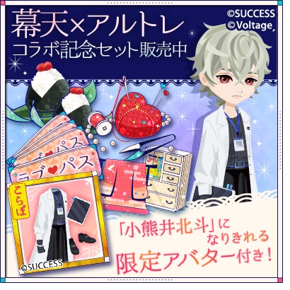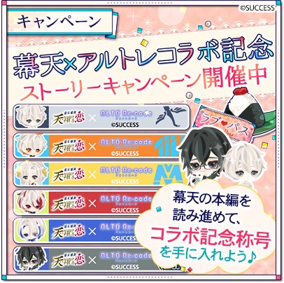 コラボストーリーを順次配信するほか、アルトたちの衣装を着用した、「幕天」に登場する彼たちのちび彼アバターや、アルトたちの幕天風ちび彼アバターが手に入るコラボガチャなど、様々な企画を開始しておりますので、この機会にぜひ「アルトレ」と「幕天」の特別なコラボレーションをお楽しみください。