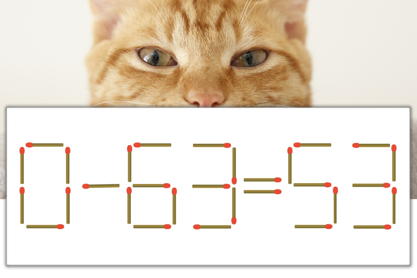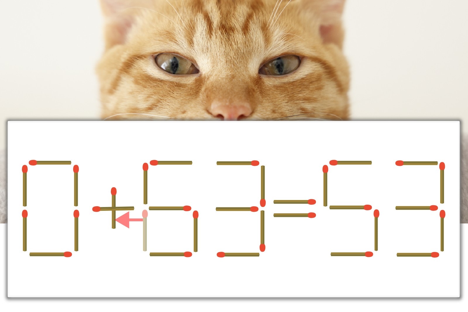 「6」を別の数字に変化させると答えが導き出せます。「6」のマッチ棒を1本移動して、「-」を「+」にしてみましょう。すると、「0+53=53」が成立します。
