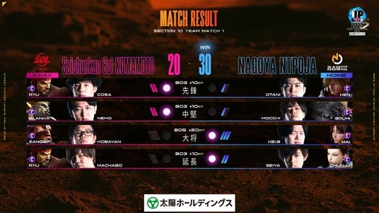 20-30で「名古屋NTPOJA」が勝利。「名古屋NTPOJA」は『ストリートファイター6』で行われるSFリーグでは初のプレイオフ進出となった。プレイオフの活躍にも注目が集まる。