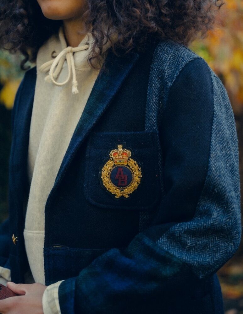 1960年代のアメリカのスポーツコートをベースに、3ボタン段返り、センターフックベント、パッチポケット仕様のオーセンティックなディテールを踏襲。メタルボタン(ウォーターバリー社製)と本コラボレーション用のエンブレムパッチがアクセントになっており、アメリカンブレザーのエッセンスを残しつつ、素材やカッティングで現代的なアメリカントラディショナルを表現している。
