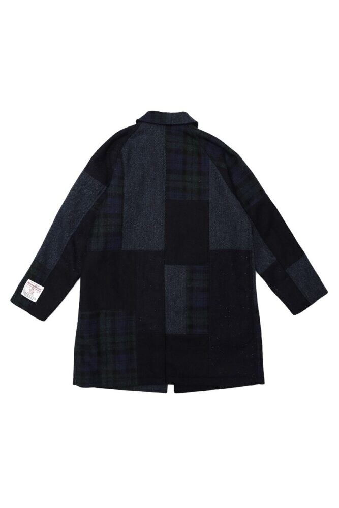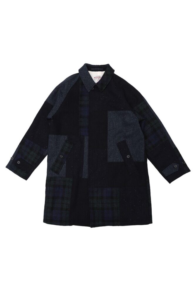 4種類の異なるハリスツイードを組み合わせたパッチワークコート。トラディショナルなバルマカーンコートを踏襲しつつ、表地と裏地の間には透湿・防風フィルム「サイトスインナー」を採用。クラシックな佇まいの中に、現代的な構築美と機能性を取り入れたアイテムである。