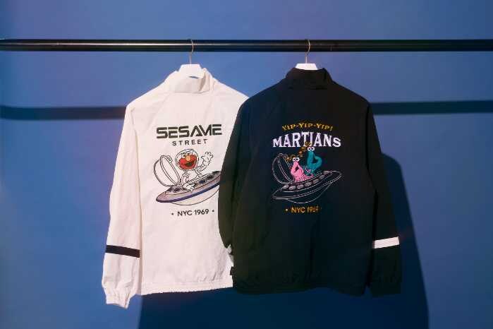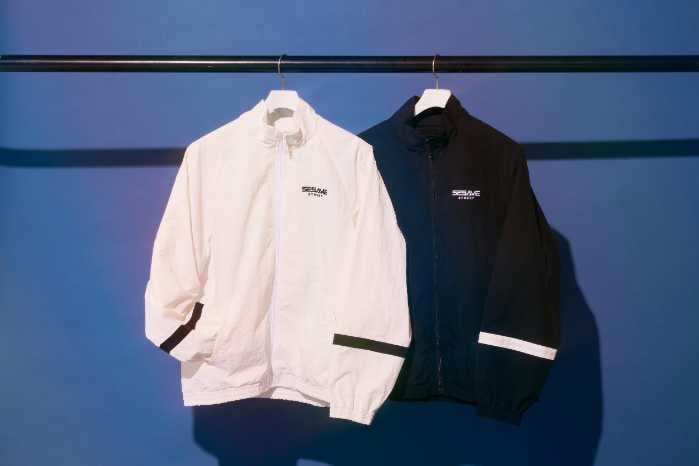 トラックジャケット(全2種/13,200円)は、背中に宇宙を旅するエルモとイップイップを刺繍。軽量で羽織りやすく、アウトドアや日常使いに◎。