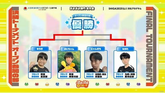 株式会社セガは、ジャパン・eスポーツ・プロライセンス認定タイトルである、対戦アクションパズルゲーム「ぷよぷよ」シリーズについて、2025年11月22日(土)、23日(日)に滋賀県で開催された「わたSHIGA輝く国スポ・障スポ 2025」文化プログラム「全国都道府県対抗eスポーツ選手権 2025 SHIGA ぷよぷよ部門」の滋賀本大会(決勝大会)にて、「小学生の部」で滋賀県代表のよし選手、「オープン参加の部」で東京都代表のゆうき選手が優勝したことをお知らせいたします。