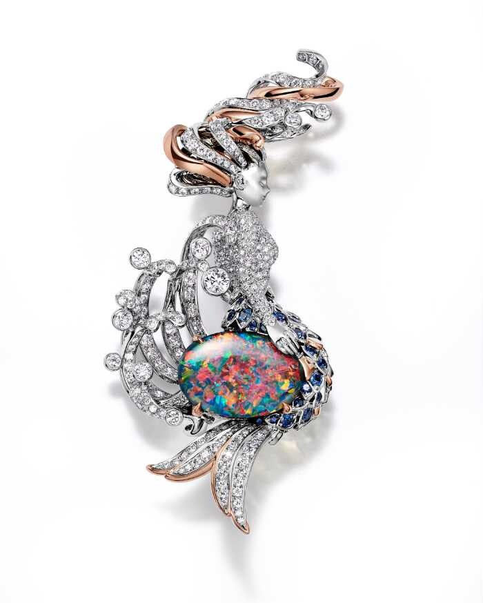 「マーメイド」の章は、プラチナとローズゴールドに10カラット超のブラックオパールを尾ひれに施したブローチが登場。リングやイヤリング、ネックレスも揃い、深海の幻想を体現します。