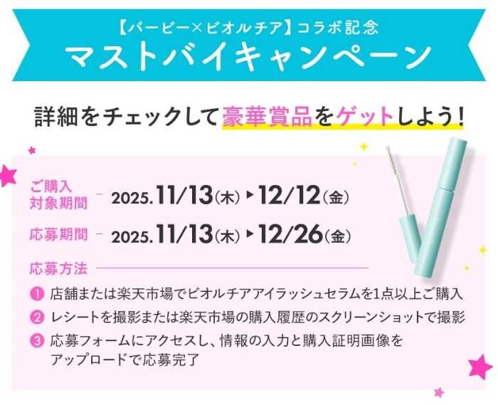 対象期間中にビオルチアアイラッシュセラムを購入し、レシート画像を応募フォームからアップするだけで参加可能。Barbie好きにも美容好きにも嬉しい企画です♪
