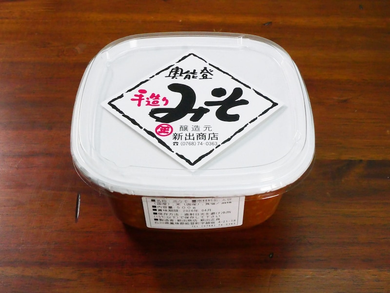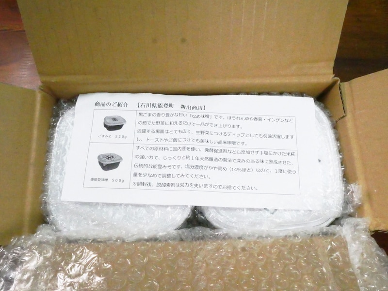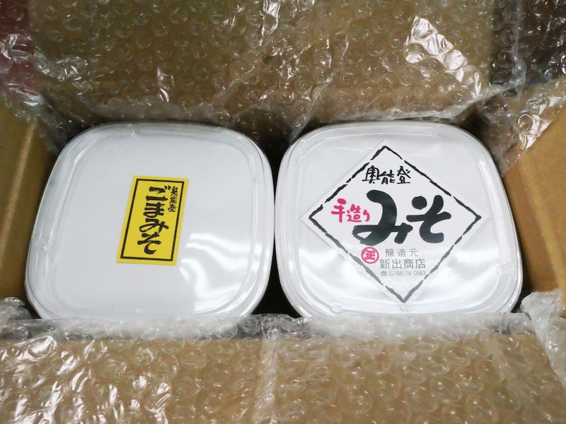 2021年11月に届いたフードは「新出商店」(石川県鳳珠郡能登町字越坂5-32)の「能登手造りみそ」と、「奥能登ごまみそ」だ。味噌は、地域性と個性が強く出る調味料。味噌職人のセンスにより、そのおいしさが爆上がりする調味料でもある。奥能登で造られた味、一体どんなものなのか、ワクワクしかない。