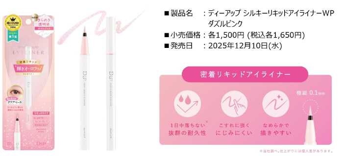 ディーアップのシルキーリキッドアイライナーシリーズに、この冬新たな偏光ラメ入りアイライナー「ダズルピンク」が登場します♡クリアピンクベースにピンク~コーラルに輝く偏光ラメとシルバーラメをブレンドし、瞳にハイライトを仕込んだような透明感のある眼差しを演出。目元はもちろん上唇の山や鼻筋にも使える、新発想の“瞳ハイライター”として、全国のバラエティショップやドラッグストア、公式オンラインストアで12月10日より発売です。