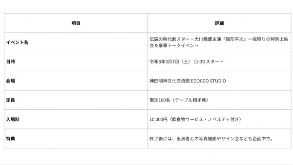 お二方から、大川橋蔵さんの類稀なる魅力、卓越した殺陣(たて)のスタイル、さらには東映時代劇の貴重な撮影秘話まで、ここでしか聞けないディープなトークが飛び出す予定。