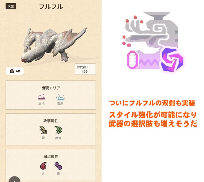 フルフルの素材を利用した武器のスタイル強化も可能になる。