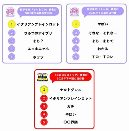 調査ではまず、今年の流行語について聞いていくことに。低学年女子(「ぷっちぐみ」読者)の1位は「イタリアンブレインロット」(※AIにより生成された架空のオリジナルキャラクターたちの総称)。SNSの動画トレンドが低年齢層にまで浸透しているようだ。これは男子(「コロコロコミック」読者)でも2位にランクインしており、性別を超えたトレンドの強さを示している。
