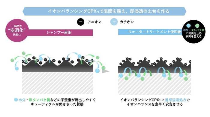 髪のキューティクルを整え、髪本来の状態に近づける「イオンバランシングCPX」と、次世代の浸透促進成分「Neosolue™-Aqulio」が、トリートメントの効果を最大限に引き出します。