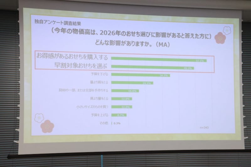 「2025年の飲食料品の値上げは、10月時点で累計2万381品目となっておりまして、昨年を大きく上回っています。おせちを販売する各社は、原材料の早期確保で価格を抑えたりセット商品の追加をするなど、コスパの良い商品を打ち出している一方で、正月には贅沢をしたいというニーズもあり、贅沢とコスパの二極化が進んでおります。」