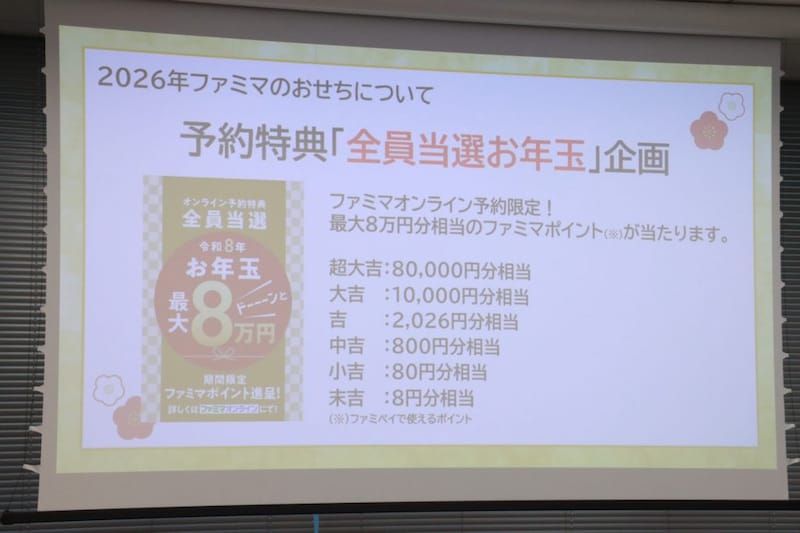 ファミマオンラインではおせちの予約に特典をつけ、最大8万円分相当のファミマポイントが当たる、ハズレなしのお年玉企画を用意。