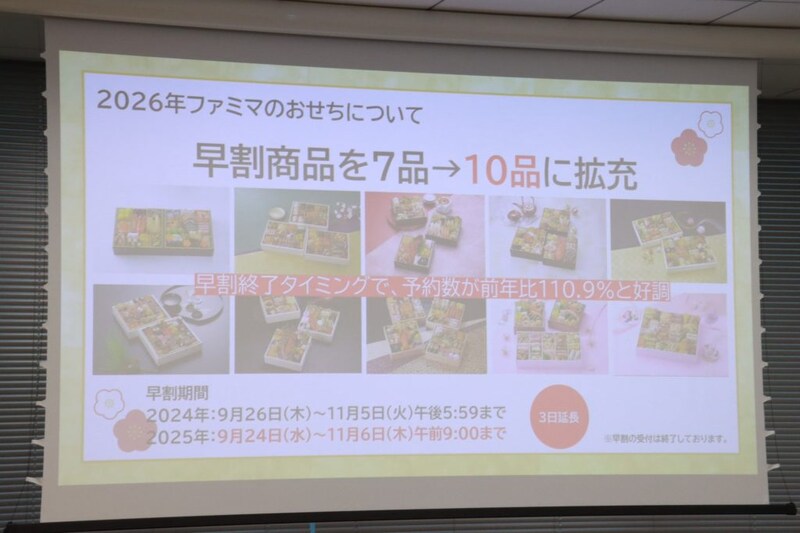 株式会社ファミリーマートは、2025年9月24日から沖縄県を除く全国のファミリーマート約15,900店およびファミマオンラインにて2026年のおせちの予約販売を実施する「ファミマのおせち2026」に関するメディア向け説明会を、都内のファミリーマート本社にて開催しました。