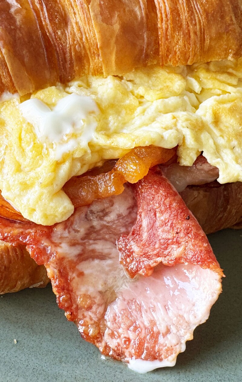 クロワッサンのなかに大量の玉子焼きとベーコン