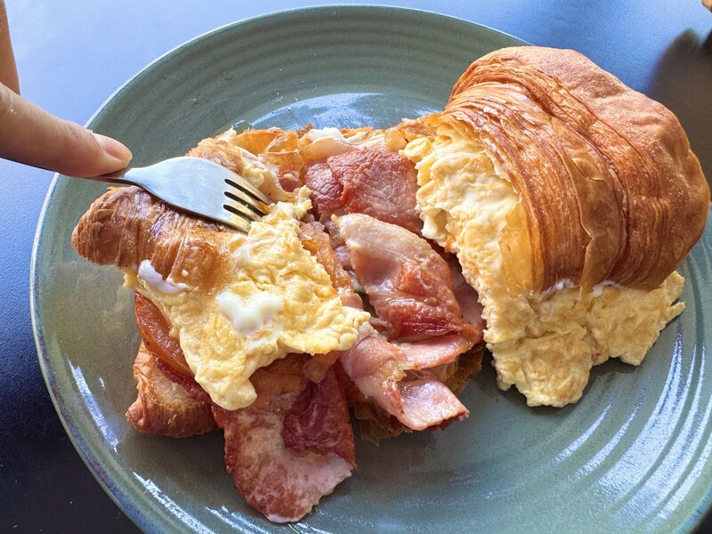ふわっふわで香ばしく仕上げられた玉子がクロワッサンの油分と生地の小麦感とすこぶるマッチ。そこに薫り豊かで旨味が濃いベーコンと、ジューシーで爽やかで極厚カットなトマト。すべてが一体化して、たまらないおいしさを演出します。これはいいものです。