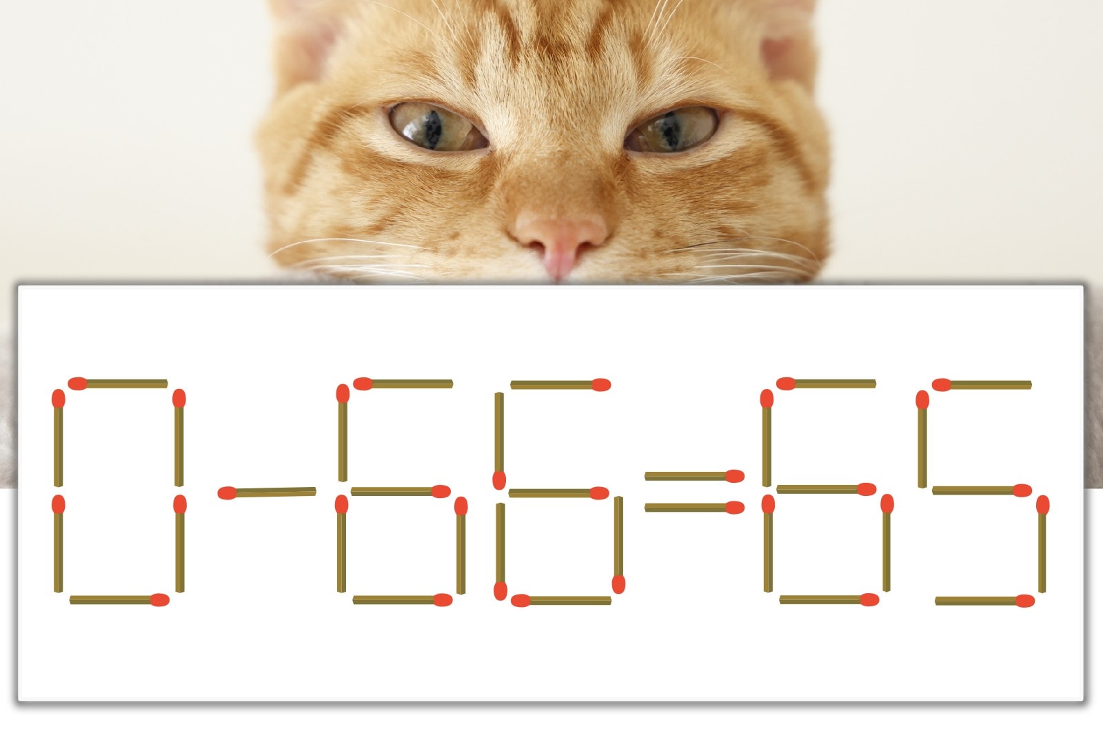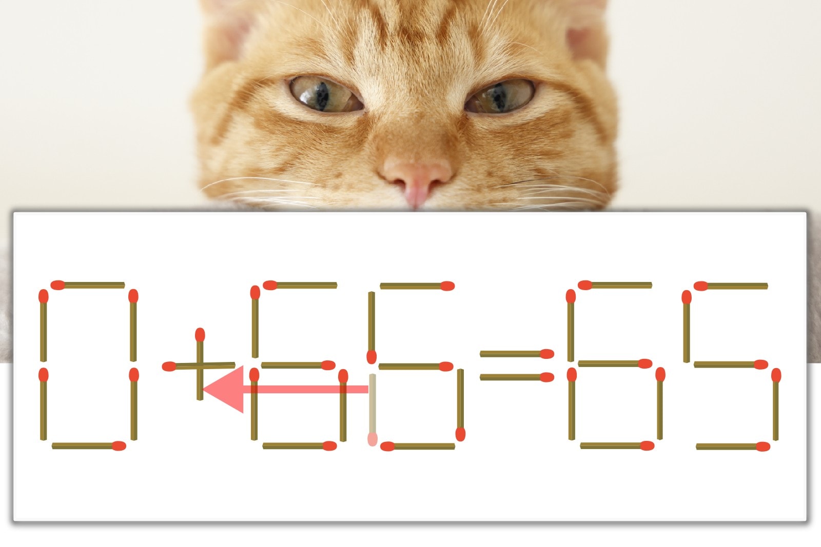 「6」を別の数字に変化させると答えが導き出せます。一の位の「6」のマッチ棒を1本移動して、「-」を「+」にしてみましょう。すると、「0+65=65」が成立します。
