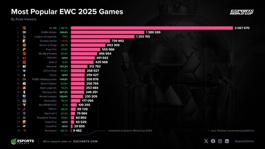 MLBB Mid Season Cup(MSC)およびMLBB Women's Invitational(MWI)は、EWCにおける視聴指標の更新を果たした。MSCは、ピーク同時接続者数(PCV)306万人超を記録し、EWC史上で最も視聴された大会となった。WC 2025では、MSCの開催規模も過去最大となり、16の地域が参加した。これは大会史上最多であり、競技の裾野が広がったことで、世界中のeスポーツ選手が国際舞台で実力を示す機会が生まれた。