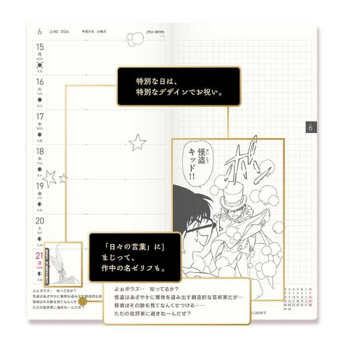 『名探偵コナン』の原作イラストを全ページにちりばめた特別版「週間手帳weeks」は、2026年4月はじまりの月曜スタート仕様。