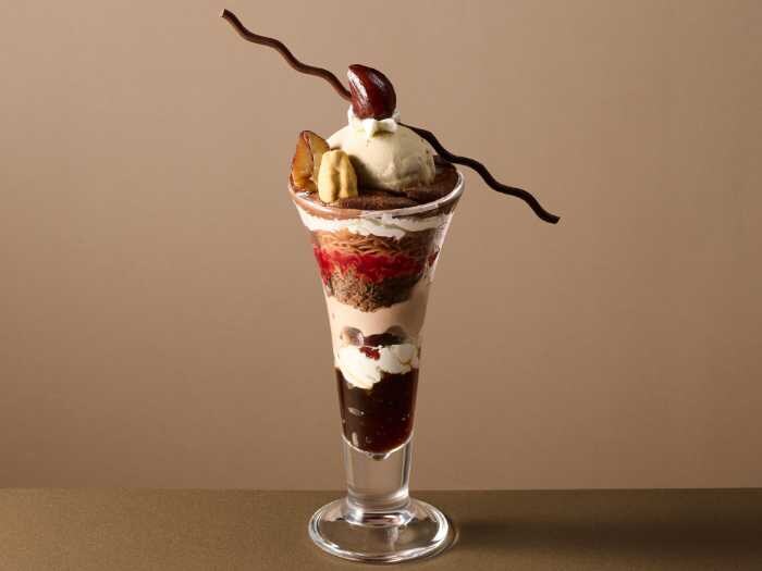 「マロンとショコラのパフェ」(1,150円・税込1,265円)は、渋皮栗アイスや栗の渋皮煮、キャラメルホワイトチョコピーカンナッツをのせたボリューム満点の一品。