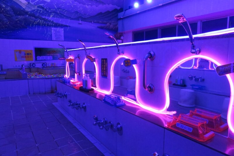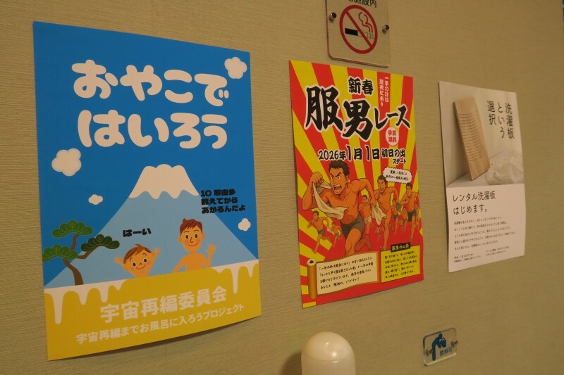 まず入口から衝撃。暖簾にはLEDが光り、まるでパチンコ店のネオンのよう。中に入ると一見普通の銭湯ですが、貼られたポスターや装飾には“クスッと笑える小ネタ”が多数。