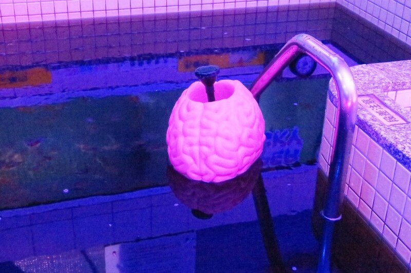 “フィーバータイム”が始まると、巨大脳みそから衝撃の噴水が吹き上がる浴槽。