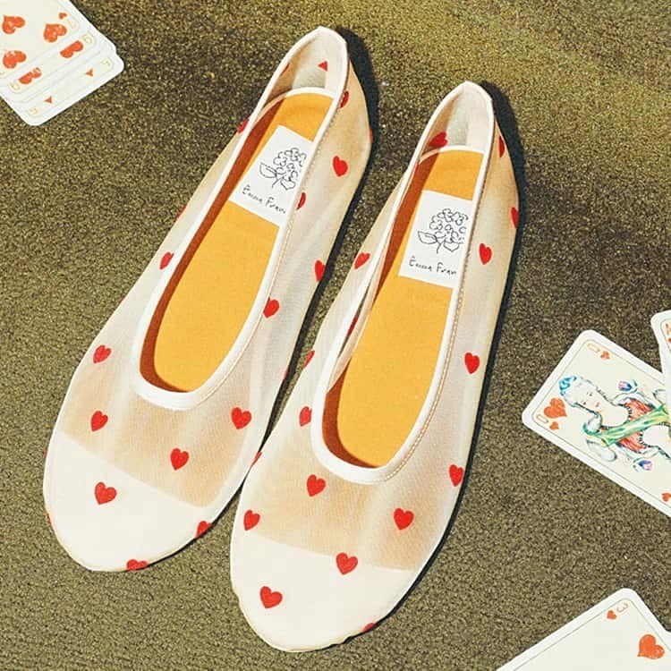柄シューズで足元にアクセントを。ヴィンテージライクなハート柄を効かせれば、シンプルコーデも一気にこなれて見える。