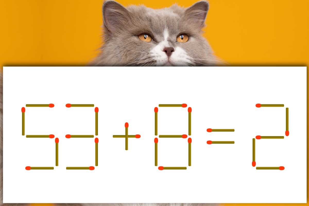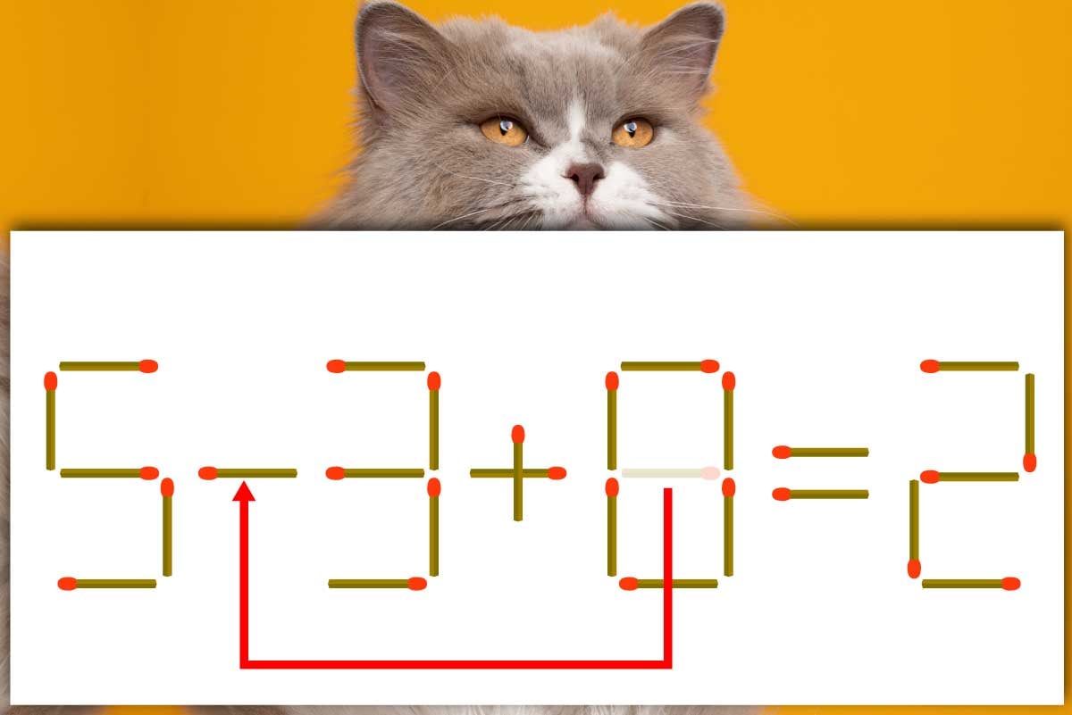 「8」の真ん中のマッチ棒を「5」と「3」の間に移動させて、「5-3+0=2」にする。※解答は複数ある場合があります。