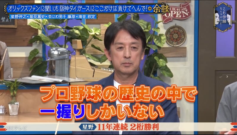 星野伸之と言えば、オリックスと阪神に在籍し、代名詞のスローカーブを武器に、通算奪三振2041個、11年連続2桁勝利をあげるなどセ・パ両リーグで活躍したレジェンド投手。同じく阪神、オリックスで活躍し、この日共演した能見篤史が、「176勝の投手はプロ野球の歴史の中でも一握りしかいない」と語ると、阪神ファンの濱家も「しかも球速で魅せるピッチャーじゃないのがスゴい」と星野のピッチングを絶賛した。