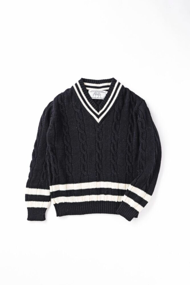 イギリス生産にこだわり、高品質なものづくりを続ける。黒ボディに白のラインが映えるクリケットセーター。1万9910円(セムインターナショナルTEL092-622-5221)