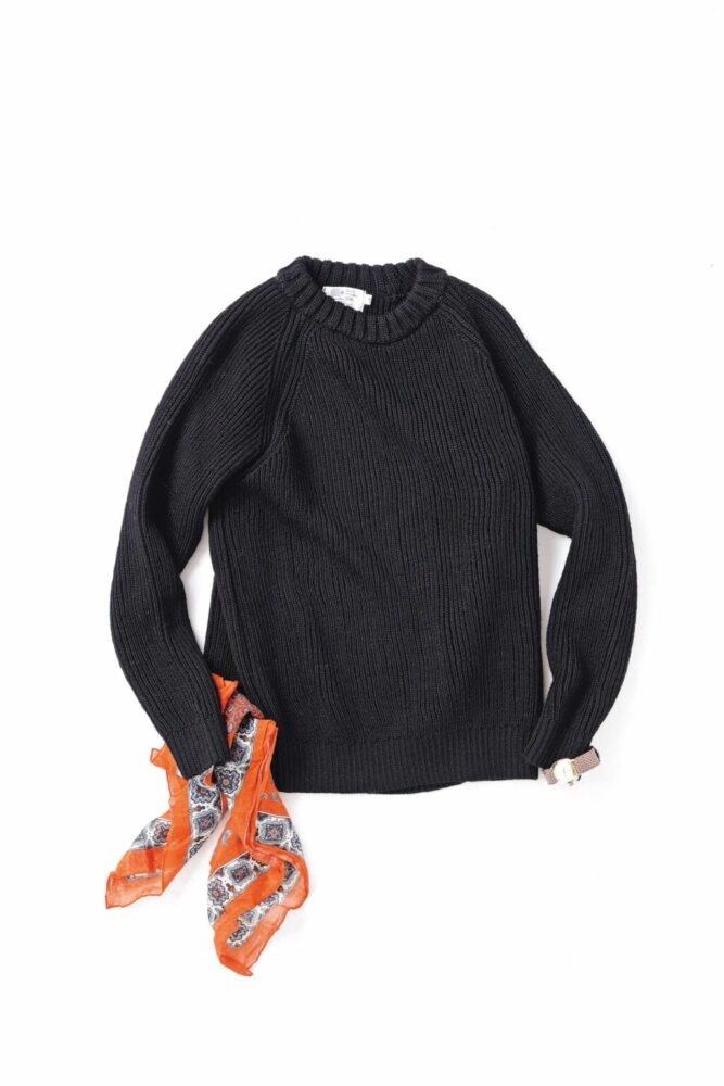 アイルランドの老舗「ケリーウーレンミルズ」によるフィッシャーマンセーター。伝統的な編みを黒で上品に。2万8600円(ブルームーンカンパニーTEL03-3499-2231)