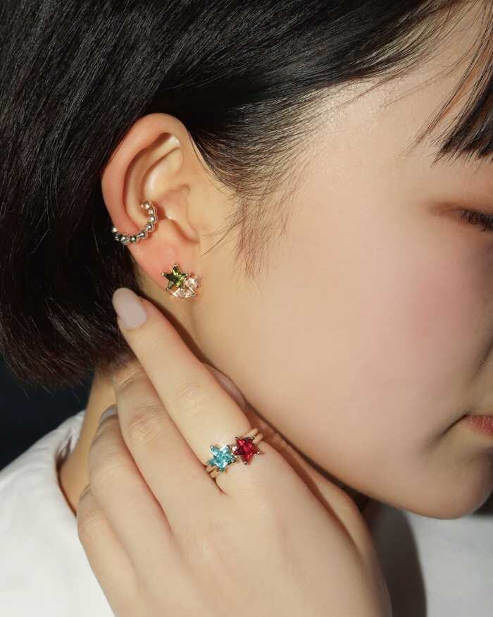 イヤージュエリーには、リングと同じスターシェイプを採用したイヤーカフやピアスが揃います。イヤーカフは25,300円、39,600円(税込・すべてシングル)。
