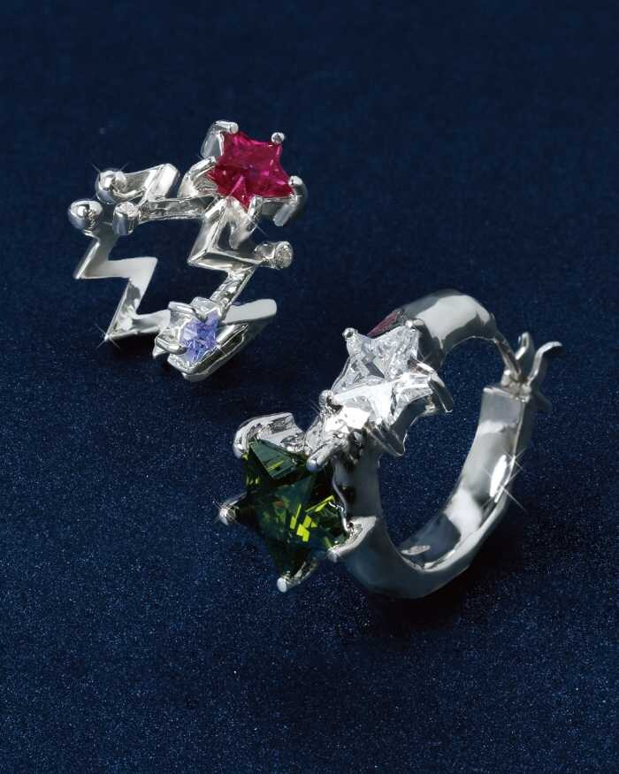 今回の「star trail」では、星座を思わせるフォルムのリングや、2つのスターが寄り添うデザインなど多彩に展開。価格は左から36,300円、31,800円(税込)。
