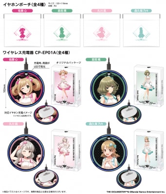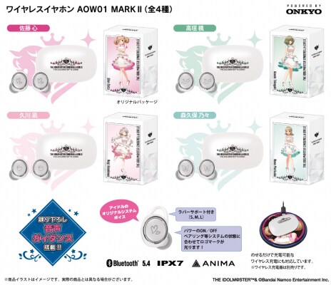 本コラボレーションモデルは「佐藤心」「高垣楓」「久川凪」「森久保乃々」の4モデル。作品モチーフとタイトルを充電ケースに、各アイドルのモチーフを左右ハウジングプレートに配置。音声ガイダンスは「佐藤心」「高垣楓」「久川凪」「森久保乃々」の新規録り下ろしボイスを搭載。電源オンやオフ、ペアリング時やタップ音、ノイズキャンセリングモード時等、それぞれ計28ワードのボイスを楽しめます。