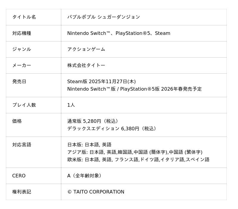株式会社タイトー(本社:東京都新宿区、以下タイトー)は、アクションゲーム『バブルボブル シュガーダンジョン』のSteam版を本日発売しました。デジタルサウンドトラックやデジタルアートブックとセットになったデラックスエディションも、本日発売しております。また、日本でのNintendo Switch(TM)版、PlayStation(R)5版を2026年春に発売することを決定しました。Nintendo Switch版はパッケージ版も発売予定です。